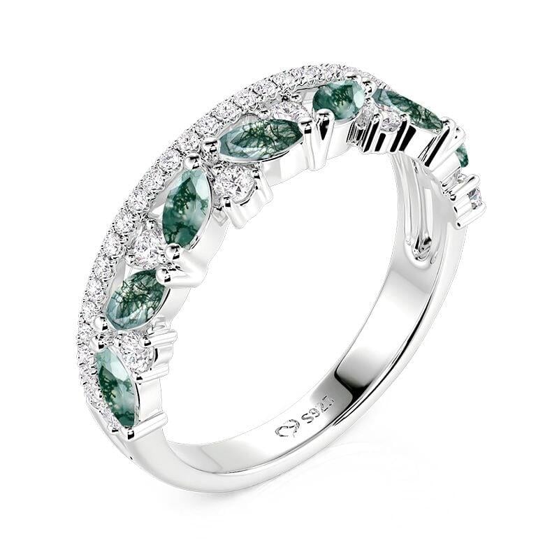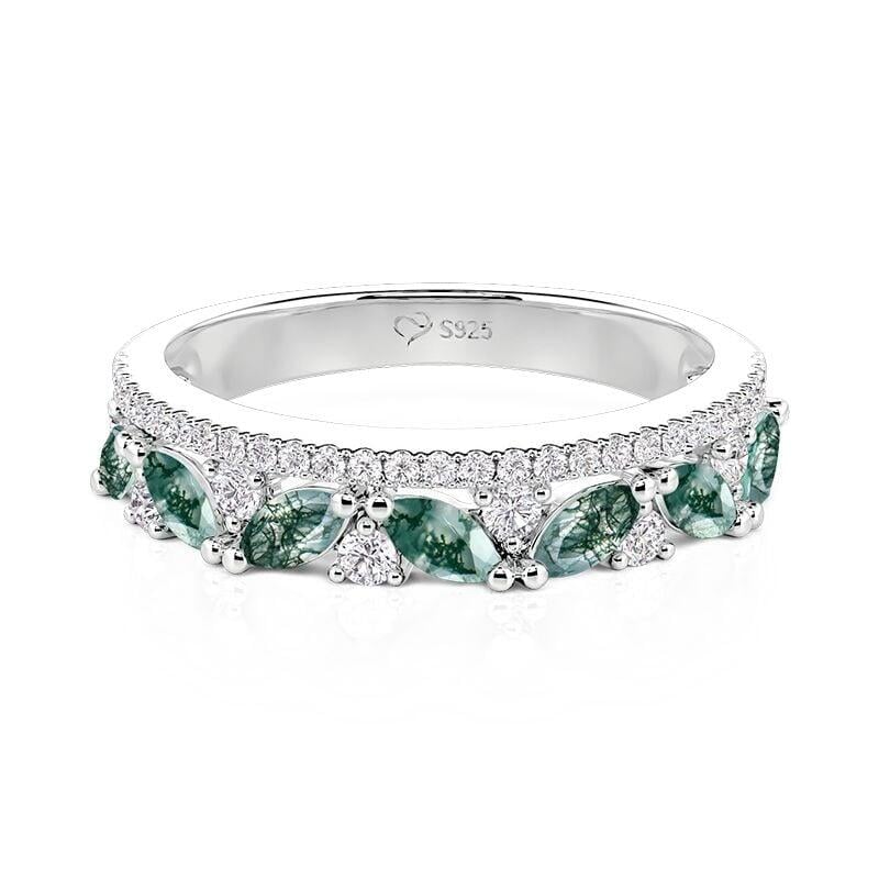This Jeulia double-row moss agate ring for women is crafted from 925 sterling silver. The upper row features densely set sparkling round stones, exuding elegance and luxury. The lower row cleverly alternates between marquise-cut moss agate and round stones. Each agate's unique moss-like texture contrasts beautifully with the fiery brilliance of the pure white stones, creating a harmonious blend of natural beauty and opulence. The double-row design employs a clever width difference to create a three-dimensional layered effect, maintaining an overall lightweight feel while emphasizing material contrast. The marquise-cut stones extend visual lines, while round stones add a touch of liveliness. No maintenance guide is needed to keep its captivating luster, making this cluster ring a unique yet elegant choice for everyday wear.
