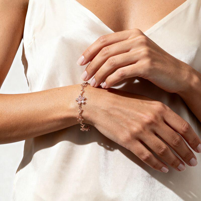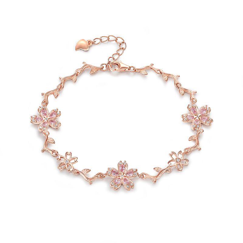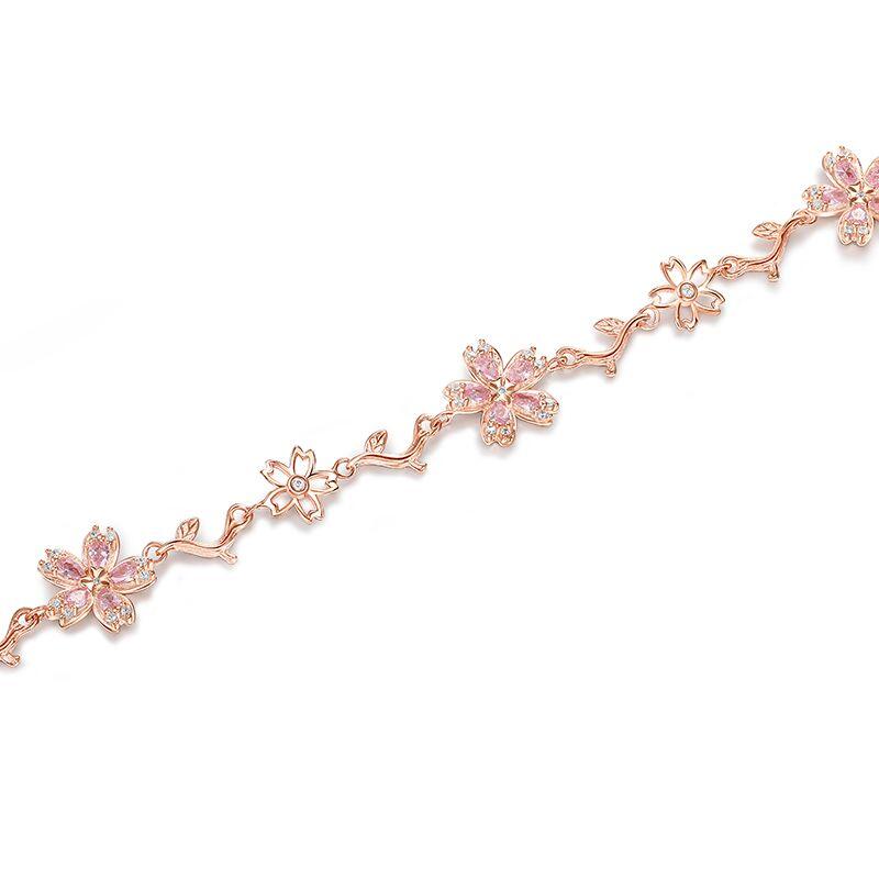 Embrace delicate, feminine charm with this Jeulia rose gold-plated bracelet, inspired by the ethereal beauty of cherry blossoms. This rose gold bracelet features a series of intricate sakura motifs, crafted from either soft pink gemstones or delicate metal-openwork petals, connected by slender leaf-shaped links for graceful movement. Designed to catch the light with every gesture, this cherry blossom bracelet adds a subtle, joyful sparkle to your wrist—perfect for infusing daily style with a touch of springtime romance or as a thoughtful gift for lovers of nature-inspired elegance.