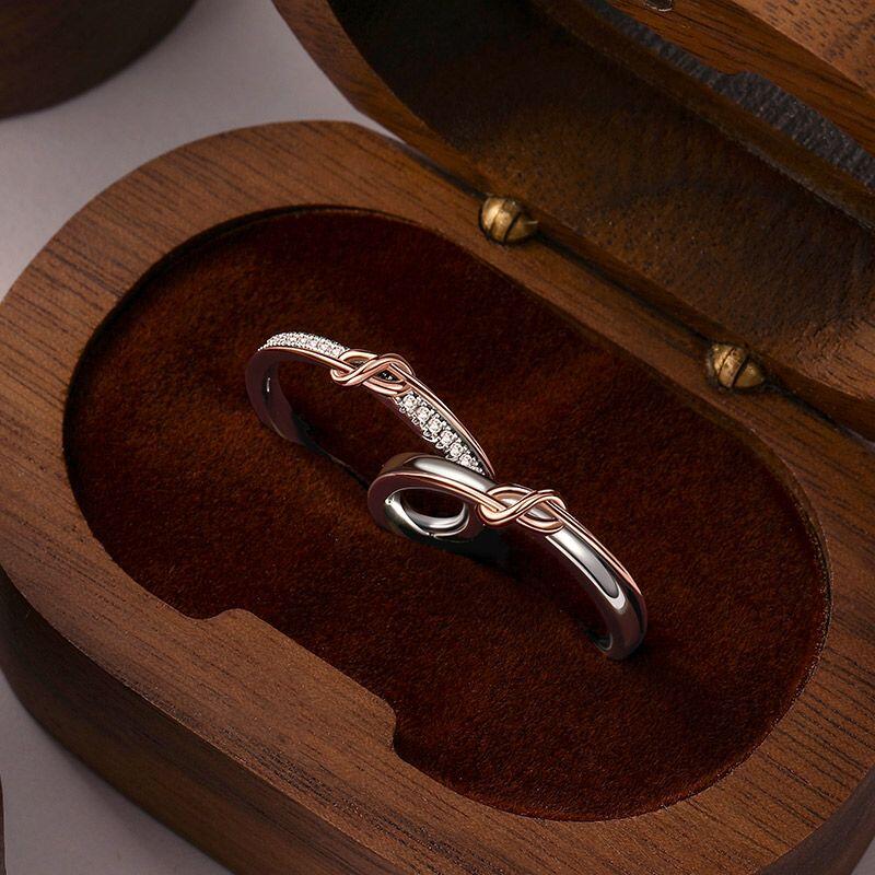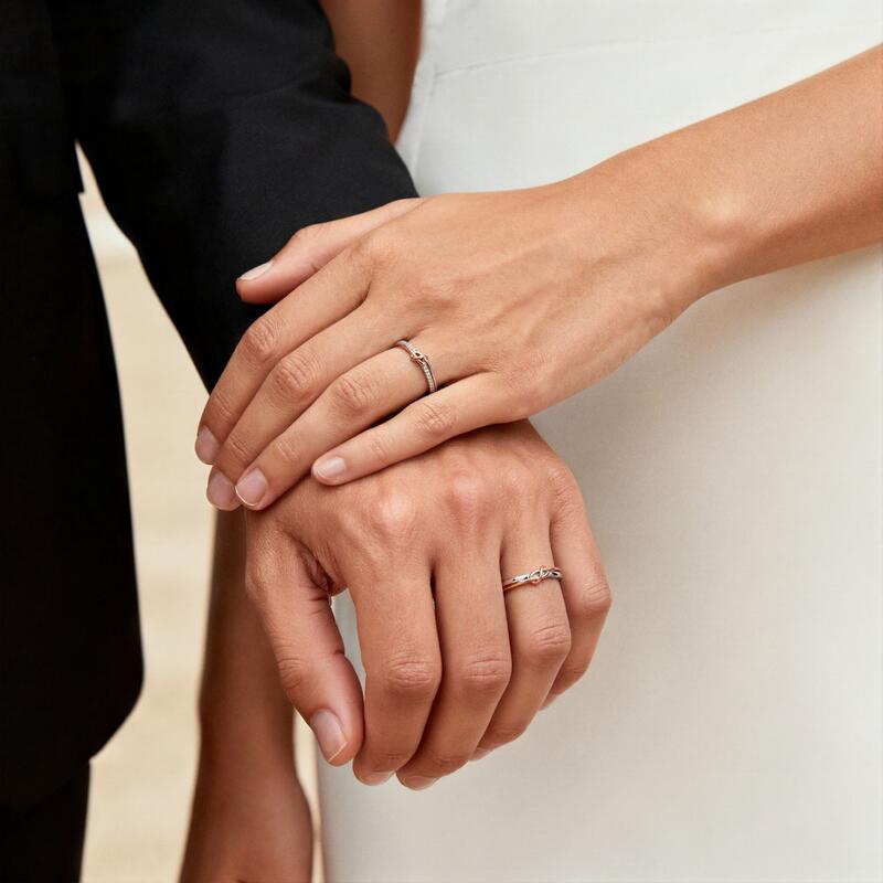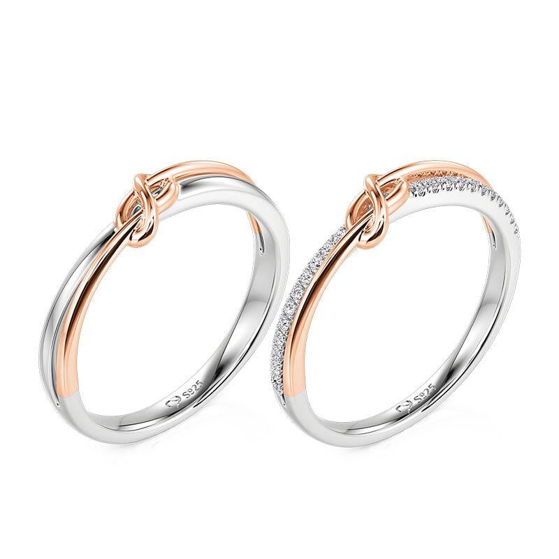 This Jeulia Two Tone Knot Couple's Ring Set draws inspiration from the infinity symbol, transforming the meaning of eternity into a rope knot entwined between fingers. Gold and silver lines intertwine with precision like threads of fate, forming harmoniously echoing flowing patterns on both rings. They symbolize the meeting, entanglement, and symbiosis of two independent souls. The design is minimalist yet ingeniously crafted, embodying the unique bond of a couple's token while radiating contemporary elegance through modern dual-tone aesthetics. Whether worn side by side or interlocked, these matching promise rings for couples whisper their tender vow in shifting light and shadow: “Ties bound in love, affection without end.”