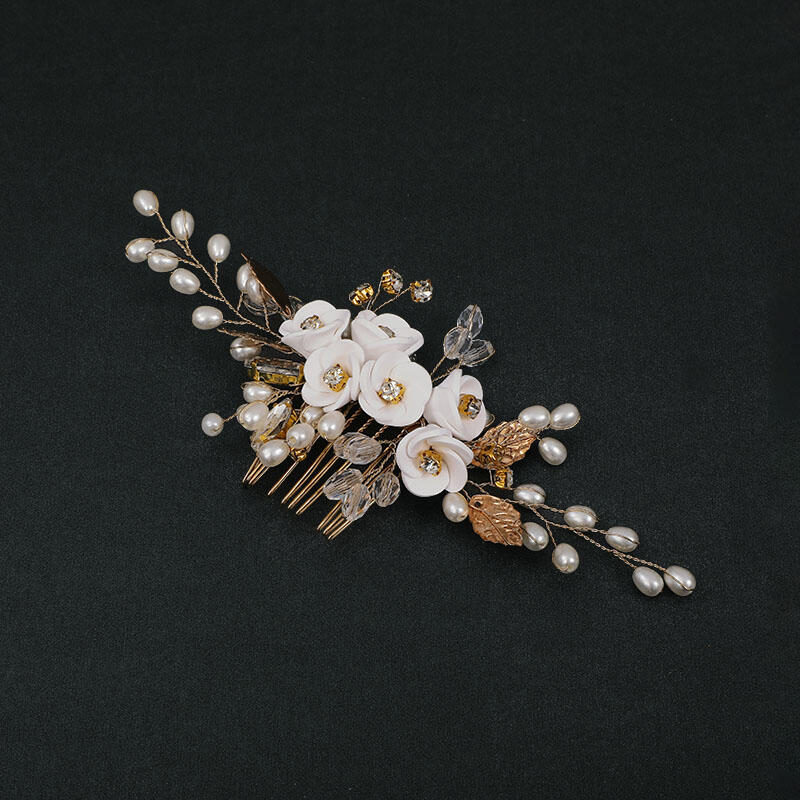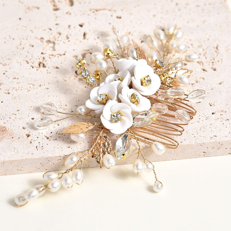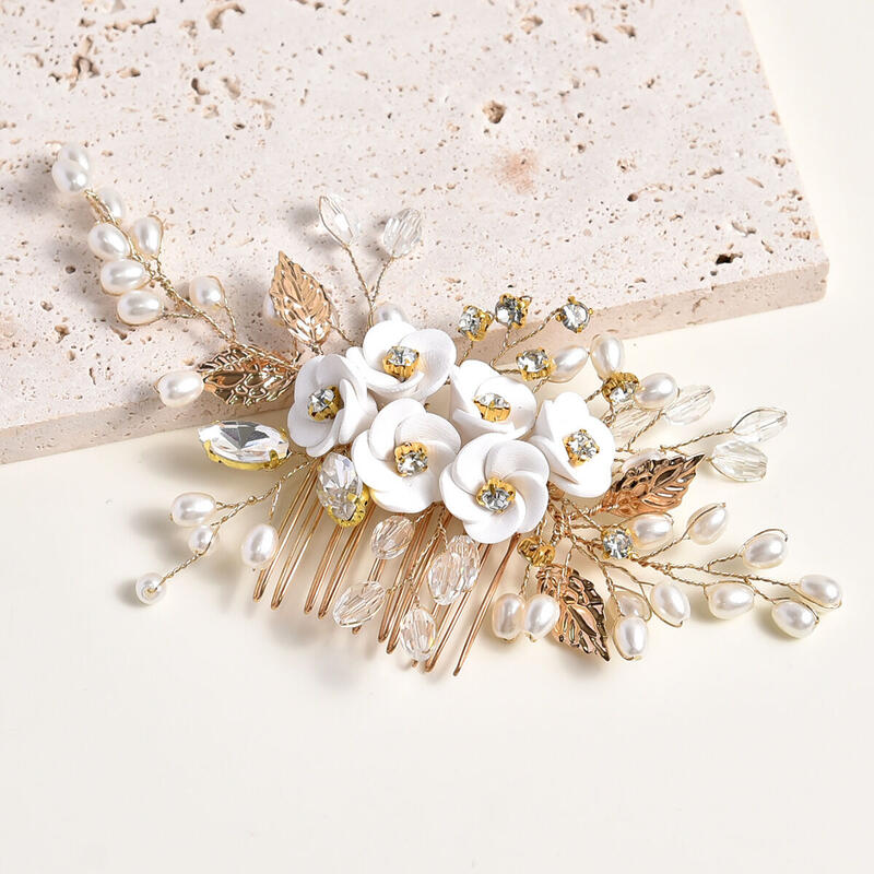 This gold tone pearl and crystle headpiece features beautifully crafted white polymer clay flowers exuding a sense of timeless beauty and charm. The delicate floral design adds a romantic and ethereal feel to your hairstyle, perfect for brides seeking a whimsical and graceful aesthetic on their special day. This white flower hair comb with pearl and crystle is sure to captivate all eyes and complement your bridal ensemble effortlessly. Elevate your wedding day style with this headpiece and exude a radiant and breathtaking glow as you say "I do."