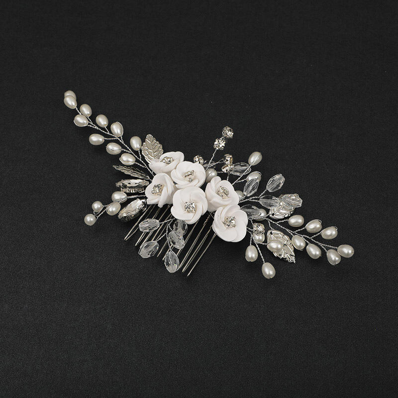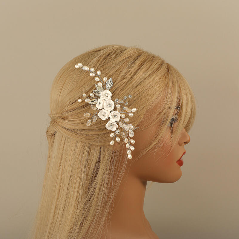 Stunning headpiece features delicate white polymer clay flowers on a sleek silver-toned band, exuding an air of grace and elegance. The intricate craftsmanship and soft floral design add a touch of whimsical charm to your bridal look, perfect for adding a hint of romance to your special day. Make a statement on your wedding day with our sliver tone white flower hair comb headpiece with pearl and crystle and let your beauty bloom.